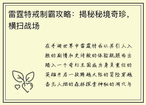 雷霆特戒制霸攻略:揭秘秘境奇珍,横扫战场