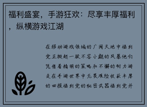福利盛宴,手游狂欢:尽享丰厚福利,纵横游戏江湖